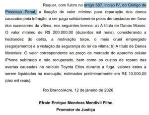 O promotor de Justiça Efraim Mendonza Mendivil, que atua no caso da morte do advogado e ativista Moisés Alencastro, funcionário do próprio Ministério Público do estado do Acre (MPAC), ocorrida em 23 de dezembro de 2025, apresentou à justiça a denúncia que vai levar os dois acusados – Antônio de Sousa Morais, de 22 anos, e Nataniel Oliveira de Lima, de 23, ao banco de réus. Além de pena máxima para ambos, “pela torpeza do crime”, o promotor pede também uma indenização pelo sumiço do aparelho de telefone celular da vítima, que não foi encontrado, e pelos danos no veículo de luxo de Moisés, utilizado na fuga dos assassinos, que foi encontrado com diversas avarias na Estrada do Quixadá, na chamada parte da cidade de Rio Branco. A data de julgamento dos acusados ainda não foi marcada. Os acusados vão ser julgados por homicídio qualificado, com as agravantes de motivo torpe, meio cruel e recurso que dificultou a defesa da vítima, além de furto qualificado do veículo e do aparelho celular de Moisés.